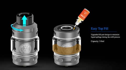 The quick slide coil design makes the operation easy. The Zeus Mesh Tank adopts high-grade KA1 to ensure dense vaping and the updated fill port absolutely lessens the liquid spillage while refilling. With the top refilling design, you can be comfortable filling e-liquid without dirty hands.